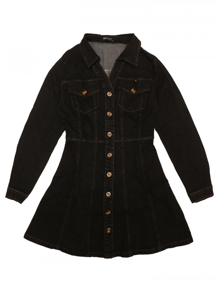 【期間限定10%OFF】Allegra K Aラインカジュアルジーンズワンピース デニムボタンダウンカラーロールアップ 長袖 レディース ブラック S