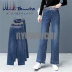 レディース ポケット付き 体型カバー 美脚 美尻 大きいサイズ ジーンズ ワイドデニムパンツ 裏起毛 ジーパン 刺繍 寒さ対策