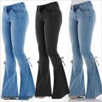 ジーンズレディースデニムパンツラッパ・ズボンリボンカットオフスーパーストレッチロングパンツブーツカット脚長美脚パンツ