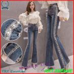 裾フリンジ ブーツカット デニムパンツ フレア ジーンズ レディース ハイウエスト 美脚 スリム Gパン ストレッチ 刺繍 きらきら パンタロンパンツ