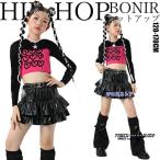 女の子 ダンス衣装 キッズ ジュニア ヒップホップ 長袖トップス へそ出し ピンク ハートプリント ブラック パンク風 ミニレザースカート フリル K-POP風 セット