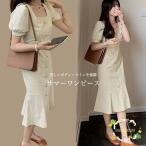 マーメイド 半袖ワンピース 夏 レディース ワンピース パフスリーブ マーメイドワンピース レトロ スクエアネック デコルテ見せ ミディ丈