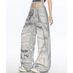 ジーンズ デニム デニムパンツ チェーンプリント×Y2K風ダメージ加工 ワイドバギーデニム レディース