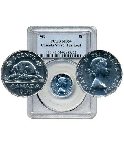 1953年カナダ5セント、希少ショルダーストラップ、ファーリーフ - チョイスアンクル、PCGS MS64