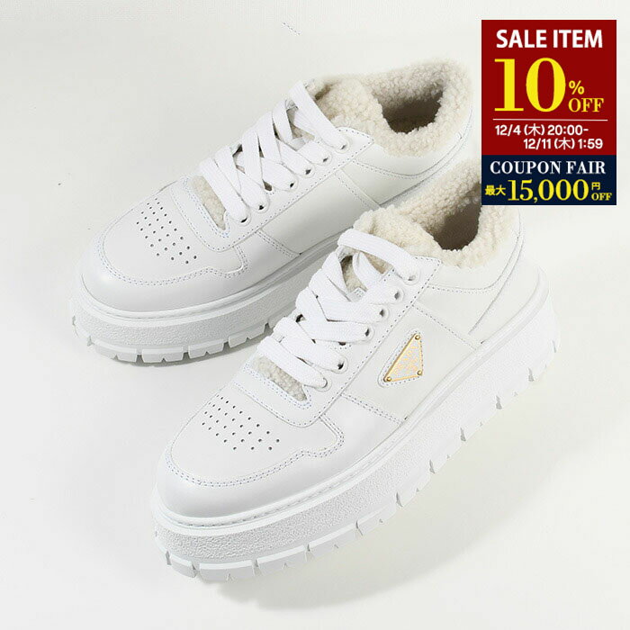 【10%OFF対象&クーポン】PRADA プラダ 靴 シューズ スニーカー レザーxシアリング 1E947M 3LEN レディース BIANCO ホワイト レザー トライアングルロゴ コットンレースアップ スポーティ 冬