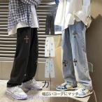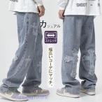 ワイドデニムパンツ メンズ ボトムス ロング プリント ストレッチ ジーンズ チノパン ストレッチ ルーズフィット ビンテージ ゆったり おしゃれ