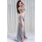 新着 ベリーダンス 衣装 オーダーサイズ衣装 コスチューム 片側半袖付きブラ ロングスカート インナーパンツ付き 2点セット 銀灰色 qc2961