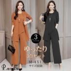 パンツセットアップ レディース 夏 秋 パンツスーツ 上下セット 3点セット ワイドパンツ ガウチョパンツ ブラウス カーディガン 無地 ゆったり 30代 40代 OL