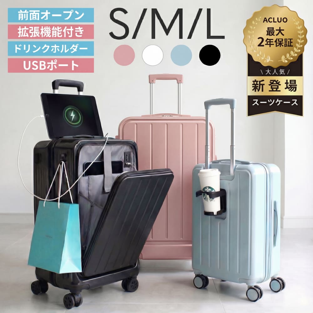 【P10倍】★40%OFFクーポンで7,788円★ スーツケース 機内持ち込み フロントオープン 軽量 キャリーケース S M L サイズ 2泊3日 4-7泊 7~10泊 USBポート カップホルダー フック搭載 旅行 38L 59L