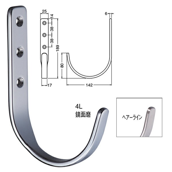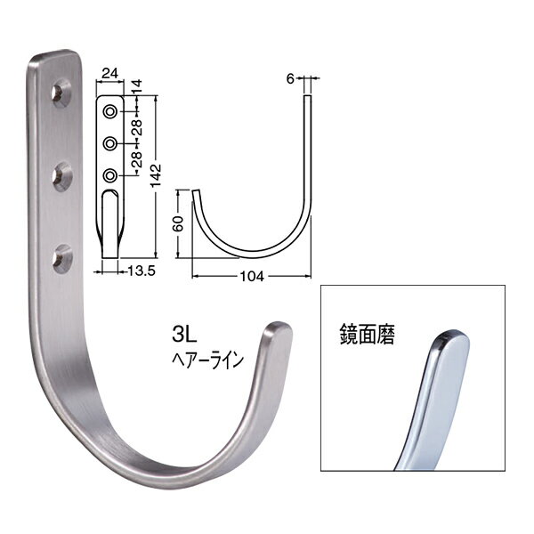 ステンレス製大型フック ST-200-3L スーパーフック ヘアーライン/鏡面磨 ねじ付き 1個