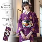 洗える着物 セット「袷着物:ばら紫色+京袋帯:黒トランプ」KIMONOMACHI オリジナル 着物と帯と帯揚げと帯締めの4点セット サイズS/M/L/LL (メール便不可)