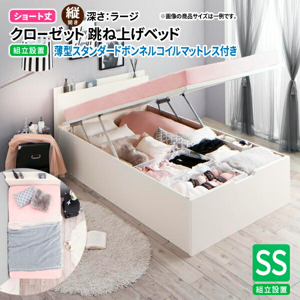 ショート丈 ガス圧式跳ね上げベッド セミシングル【組立設置付】 薄型スタンダードボンネルコイルマットレス付き 縦開き セミシングルベッド ショート丈 深さラージ 送料無料