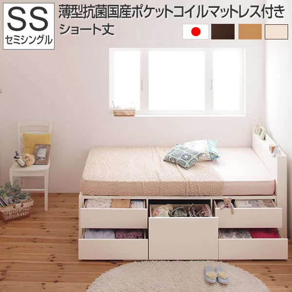 組立設置付 日本製 収納付きベッド セミシングル ショート丈 収納ベッド 収納付きベッド チェストベッド 宮付き コンセント付き 引出し付きベッド ワンルーム 一人暮らし 子供部屋 ベット オシャレ 木製 薄型抗菌国産ポケットコイルマットレス付き セミシングルベッド