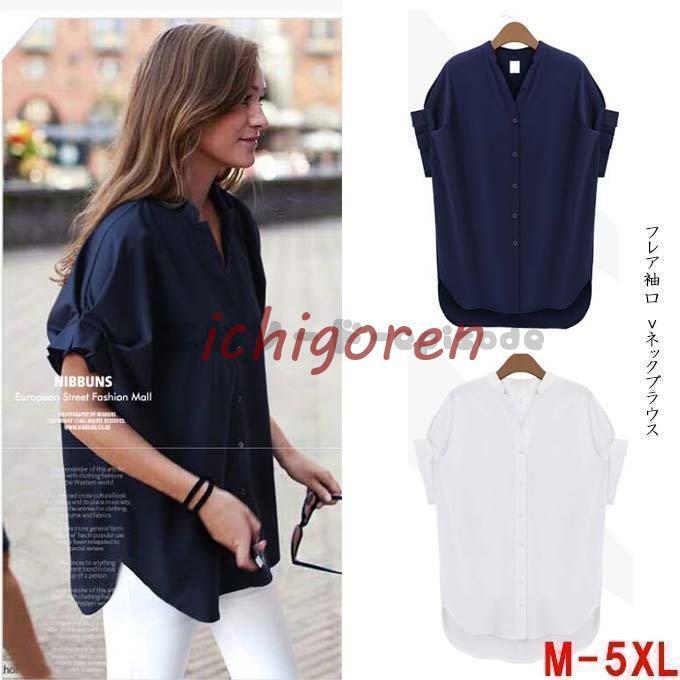 【期間限定10%OFF】シャツ ブラウス 半袖 ビッグサイズ レディース 無地トップス フレア袖口 欧米セレブ愛用Vネック半袖