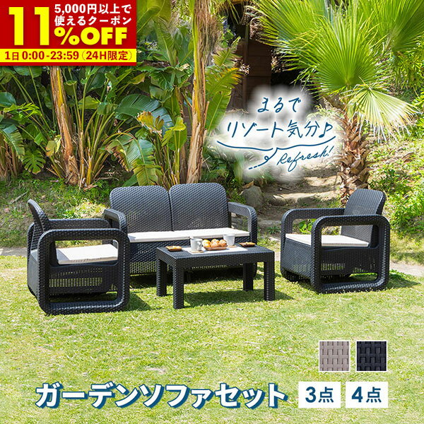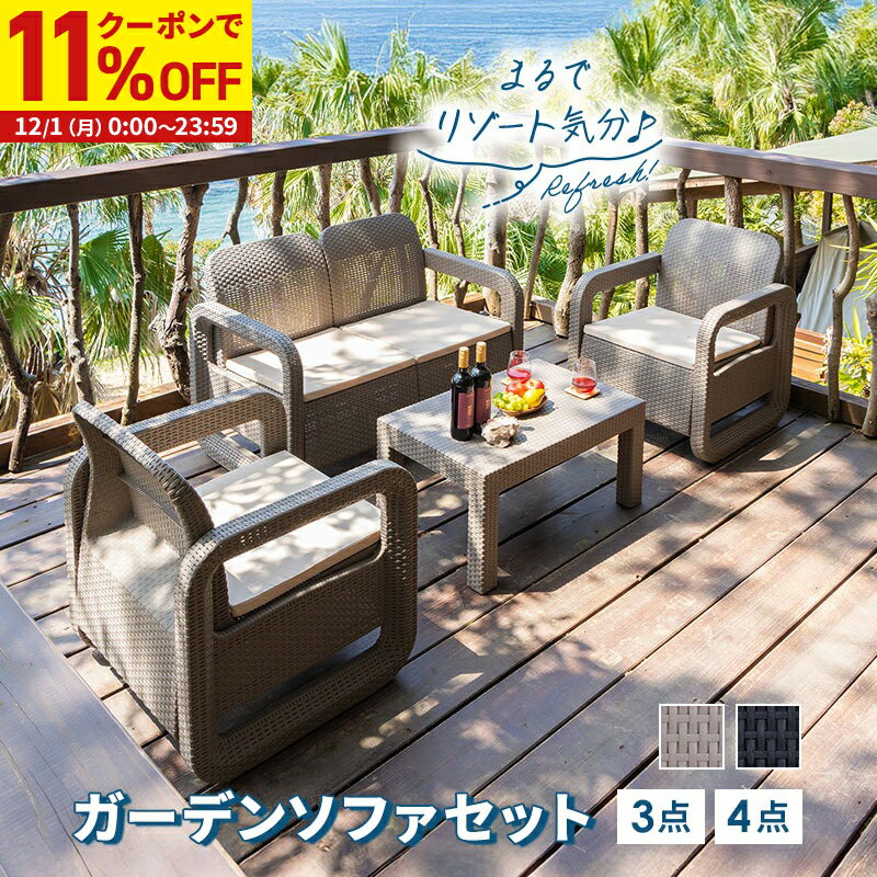 【クーポンで11%OFF★12/1 0:00〜23:59】 ガーデンセット ソファ テーブル 3点セット 4点セット ラタン調 ベージュ ブラック 肘掛け クッション付き 軽い ガーデンファニチャー 庭 ホテル カフェ ベランダ テラス 屋外 屋内