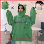 かえる柄 パーカー かわいい 裏起毛 カエル目 ロング トレーナー 韓国ファッション レディース 萌え トップス 森ガール ゆったり スウェット
