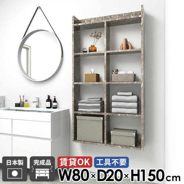 トイレ棚 石膏ボード ウォールラック 洗面所棚 オープンシェルフ 壁面 おしゃれ 5段 吊戸棚 賃貸 脱衣所 タオルラック 鏡面 大理石風 ディスプレイ棚 完成品 本棚 壁面収納 インテリア 幅80cm 奥行20cm 高さ150cm 【MiraiウォールラックH 8020150 graystone】 ☆