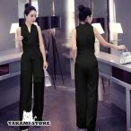 オールインワン サロペット かっこいいパンツドレス ノースリーブ Vネック ワイドパンツ デート服 通勤服 オフィス 春服 夏服 黒 白 大きいサイズ 3l
