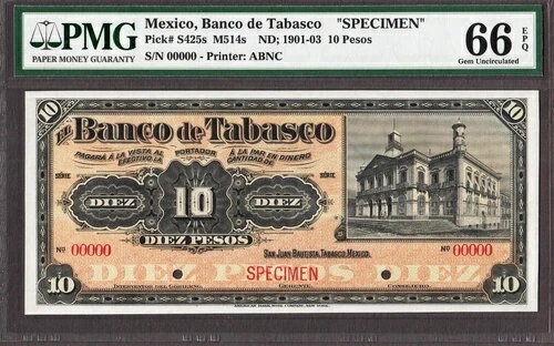 メキシコ、バンコ・タバスコ 10ペソ 見本 1901-03 P-S425s M514s GEM UNC PMG 66 EPQ