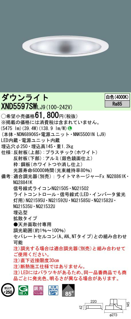 【法人様限定】パナソニック XND5597SW LJ9 LEDダウンライト 85度 拡散 調光 埋込穴φ250 白色【NDN68906S + NNK55001N LJ9】