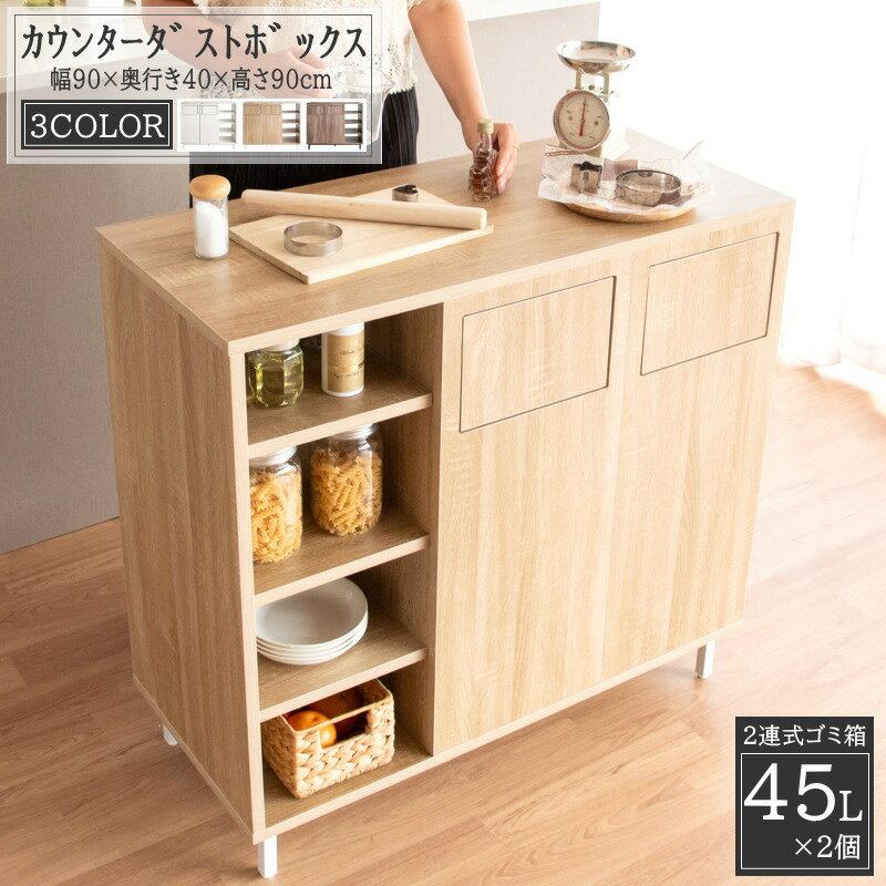 2連ごみ箱 カウンター式ゴミ箱 カウンターダストボックス 45Lタイプ おしゃれ 分別 大容量 シェルフ 作業スペース オープンラック 高さ90cm 組み立て式 間切り ゴミ箱 45リットル マグネット プッシュ式扉 スイング式扉 におい漏れ軽減 可動棚付き Harmoa ハルモア 送料無料