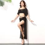 ベリーダンス 衣装 セット レッスン着 セットアップ スリット入りスカート 半袖トップス 2点セット ストレッチメッシュ 動きやすい伸縮生地 ダンス衣装 ステージ