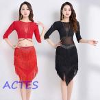 ベリーダンス 衣装 セット レディース 社交ダンス衣装 黒 赤 レッド 五分袖 へそ出し Vネックトップス フリンジスカート ベリーダンス レッスン着 上下セット ス