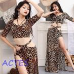 ベリーダンス 衣装 レッスン着 セットアップ 豹柄 ヒョウ柄 総柄 おしゃれ ベリーダンス衣装 発表会 衣装 半袖 チョリ トップス Vネック スリットオーバー レオ