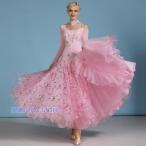 社交ダンス ドレス フリル モダンドレス ラインストーン ビジュー 社交ダンス衣装 長袖 大きい裾 モダン スタンダード ワルツ レディース ワンピース 舞台用