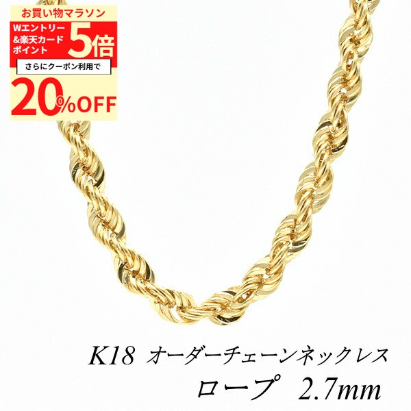 【20%OFFクーポン+Wエントリー&楽天カードでP5倍23:59まで】18金 ネックレス ロープチェーン 2.7mm 長さ選べるオーダーチェーン 40cm〜120cm 45cm 50cm 55cm 60cm 18金 K18 18K イエローゴールド 180日間お修理保証