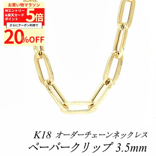 【20%OFFクーポン+Wエントリー&楽天カードでP5倍23:59まで】18金 ネックレス ペーパークリップチェーン 3.5mm 長さ選べるオーダーチェーン 40cm〜120cm 45cm 50cm 55cm 60cm 18金 K18 18K イエローゴールド