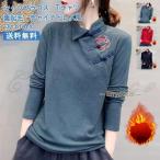 シャツブラウス レディース Tシャツ チャイナドレス風 刺繍 長袖 裏起毛 トップス カジュアル ゆったり 防寒 暖かい 可愛い 秋冬 おしゃれ