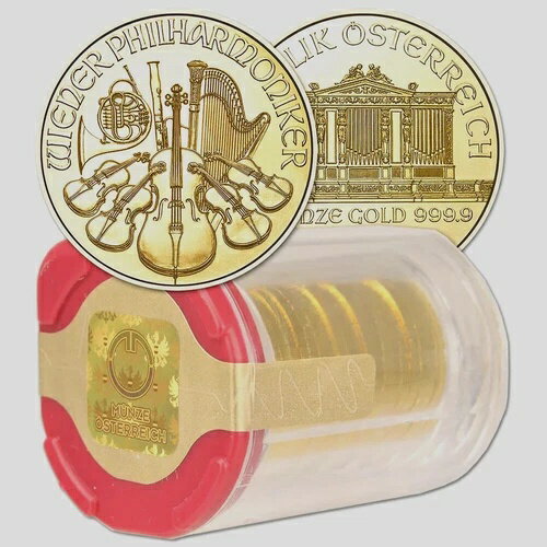 2025年 オーストリア フィルハーモニー金貨 1/10オンス 10ユーロ - 1ロール 20枚入り BUコイン ミントチューブ入り