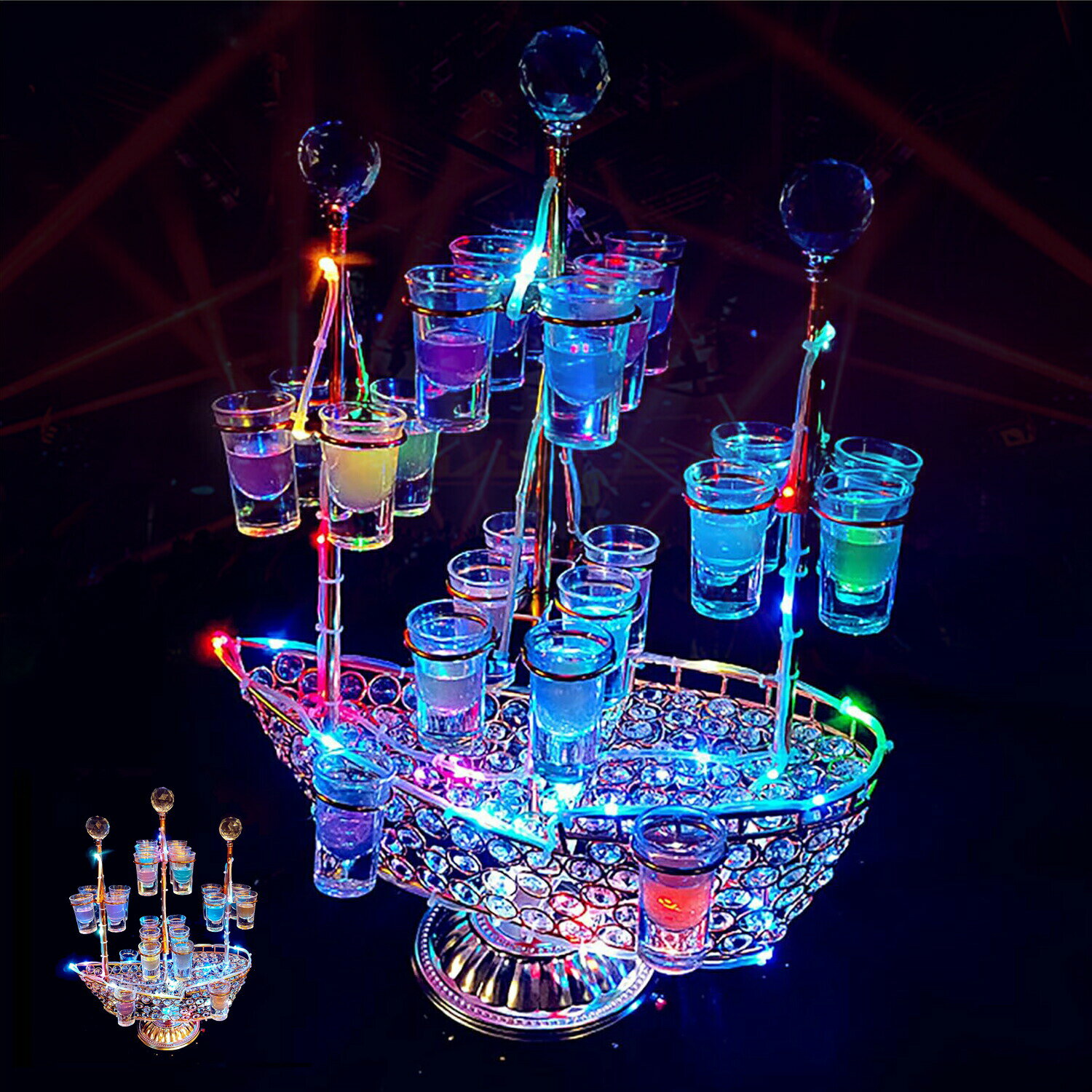 【SS期間50%OFF!!】テキーラ観覧車 船 LED酒ボトルの表示棚 カクテルグラスホルダー 24カップ LED酒グラス 収納ラック バーホテルKTVナイトクラブに最適 パーティ パーティ 装飾品 祝日の雰囲気作り ナイトクラブ