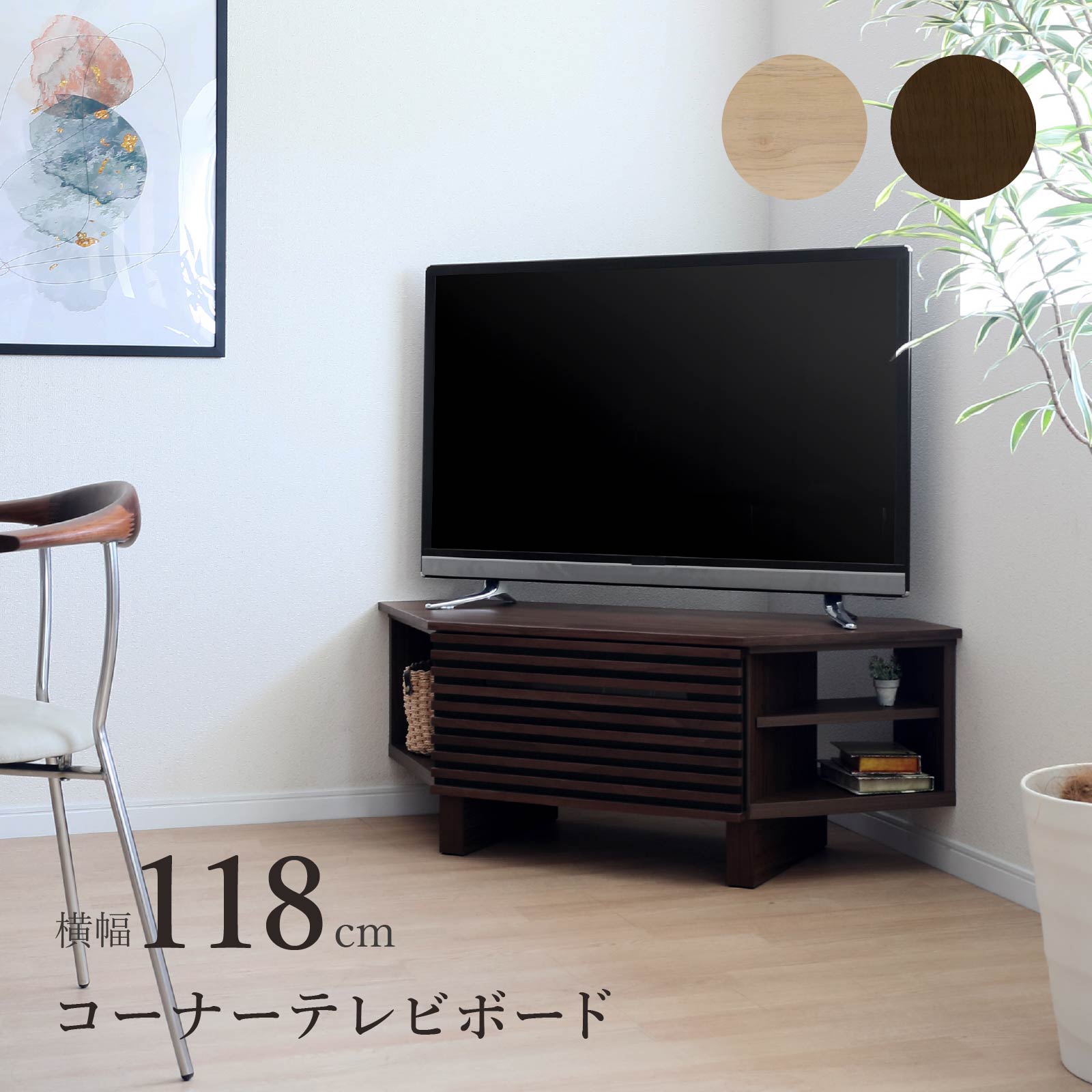 【39%OFF&超得クーポン!スーパーSALE】 テレビ台 ローボード コーナー 幅118cm 半完成品 収納 引き出し おしゃれ 北欧 テレビボード 格子 ルーバー 木目 オーク ウォールナット 柄 リビングボード 脚付き 高さ 42.5 cm TV ナチュラル ブラウン 赤外線 リモコン操作
