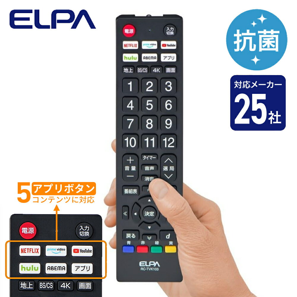 ≪衝撃の99%OFF★12/1先着クーポン限定≫ テレビリモコン RC-TVK103 ELPA エルパ 25社対応 抗菌アプリボタン 汎用リモコン テレビ リモコン 代用 代替え 代替 各社 対応 アプリボタン マルチリモコン シンプル TVリモコン 朝日電器