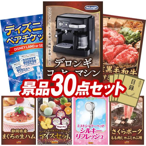 忘年会景品 30点セット 特大パネル 豪華目録 ビンゴ 結婚式 披露宴 二次会 忘年会 新年会 ゴルフコンペ 景品セット 【デロンギ コーヒーメーカー、ディズニーペアチケット】 送料無料 特大パネル 豪華目録付き