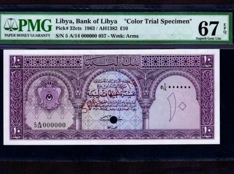 リビア 10ポンド 1963年 P-32cts * PMG Superb Gem Unc 67 EPQ * カラートライアル標本
