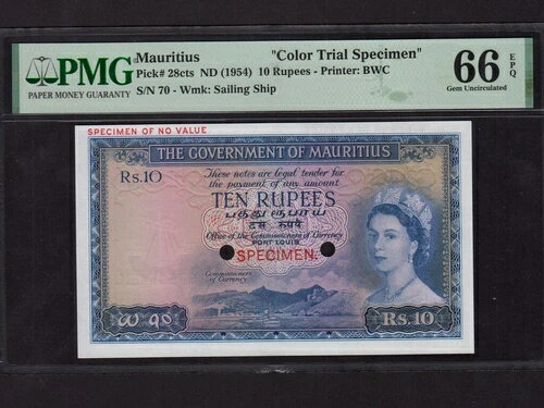 モーリシャス:P-28cts、10 R、1954年 * QEII * カラートライアル標本 * PMG Gem UNC 66 EPQ