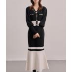 \20%OFFクーポン配布中/ワンピース レディース ニットワンピース 長袖 ミディ丈 トランペットライン 金ボタン ディープカフス ボリュームスリーブ ハイウエスト 配色ニット マーメイドシルエット 暖かい 通勤 秋 冬 女の子 SAISON DE PAPILLON sdp8103