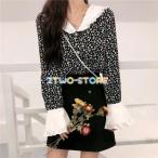 ドレス キャバドレス パフスリーブ長袖トランペットネックリボンドット柄スカートミニドレス (Sサイズ〜XLサイズ)