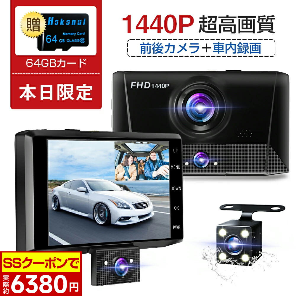 【進化】ドライブレコーダー 前後車内カメラ 64GBカード付き 3カメラ 170度超広角 フルHD高画質 録音機能 駐車監視対応 WDR 衝撃録画