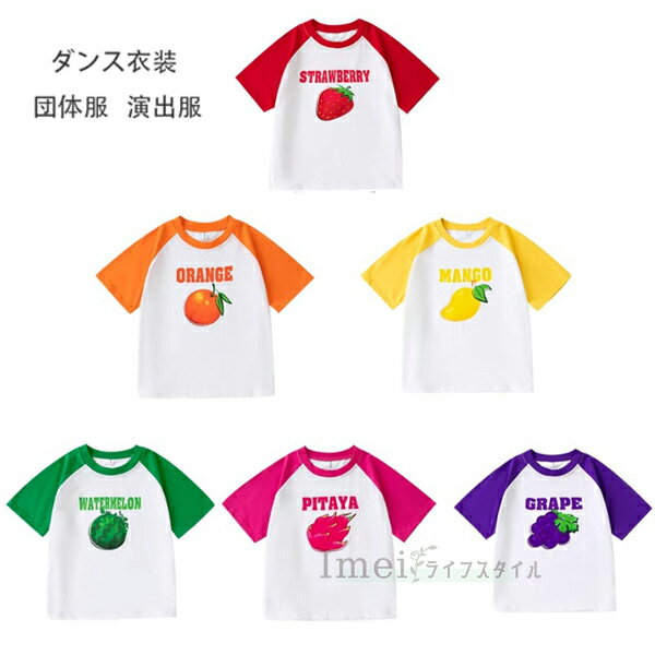 【6%OFFクーポン】団体服 演出服 フルーツ柄 Tシャツ レッド オレンジ イエロー グリーン バラ パープル Tシャツ キッズ ダンス衣装 運動会 応援団 クラス活動 チアガール 女の子 男の子 tシャツ 普段 ジュニア かわいい ダンス 新品 ドラムショー 公演服 フルーツ柄 tシャツ