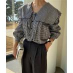 ブラウス シャツ ビッグカラー チェックフリルトップス レディース