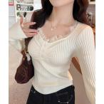 ニット セーター レースドッキングリブ編みニットトップス レディース
