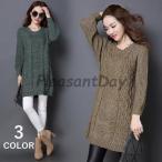 ニットワンピース ニットチュニック 長袖 ラウンドネック クルーネック ショート丈 ケーブル編み スタッズ付き シンプル 無地 レディース ゆったり