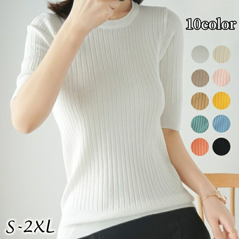 送料無料 ニット セーター 半袖 クルーネック トップス レディース リブニット 無地 単色 シンプル 大きいサイズ有 定番 着回し おしゃれ かわいい 重ね着 フェミニン オフィス 通勤 通学 カジュアル デイリー お出掛け 女性用 婦人用