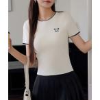ニット セーター リボン刺しゅう配色トリミングクルーネック半袖ニットトップス レディース