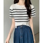 ニット セーター クルーネック半袖ボーダーニット レディース