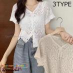 カーディガン ボレロ サマーニット レディース 半袖 ショート丈 レース 透かし編み トップス アウター 羽織り Vネック スクエアネック クロップド